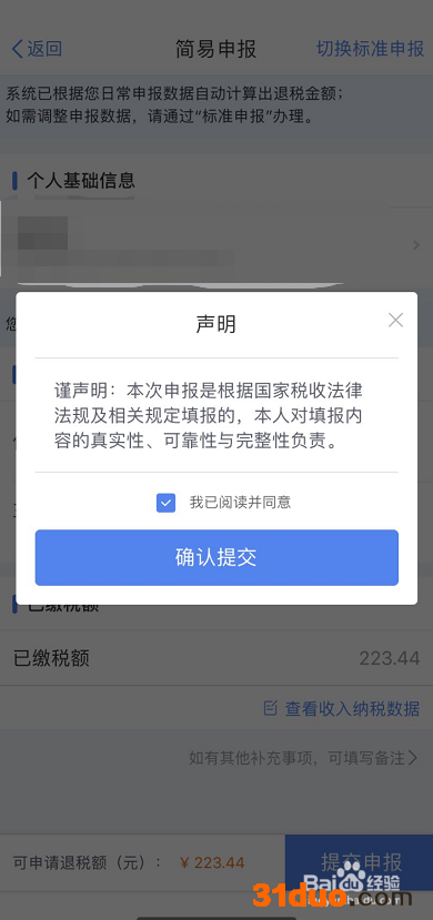 6、勾选“我已阅读并同意”以及点击“确认提交“。