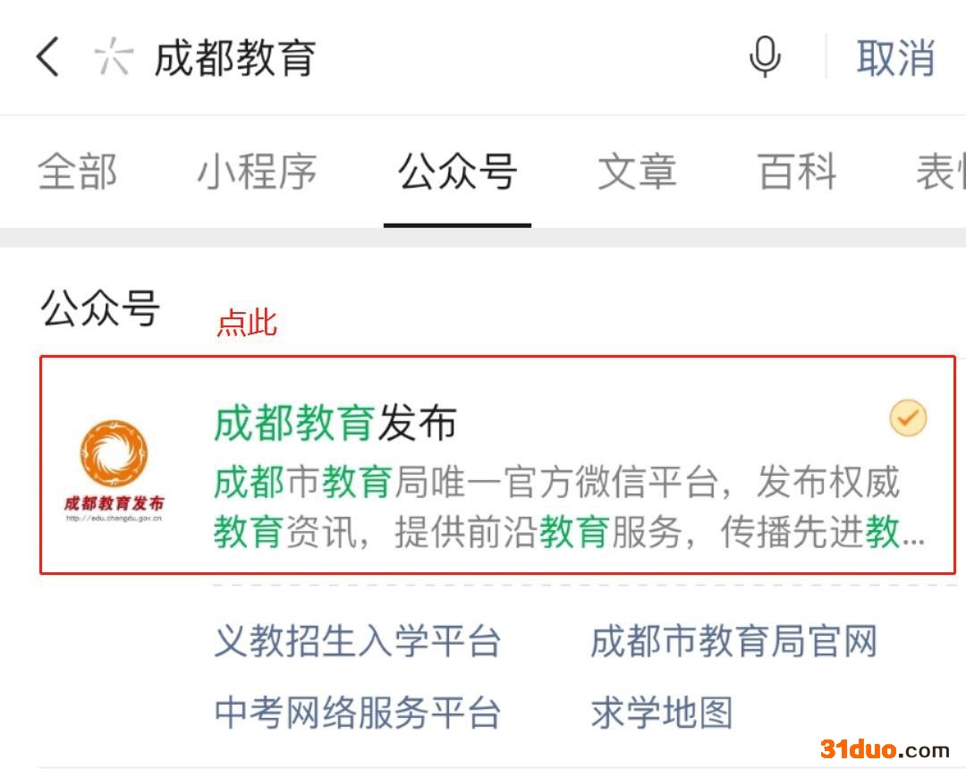 1.使用微信搜一搜搜索“成都教育”,点击进入成都教育发布微信公众号,如下图所示;