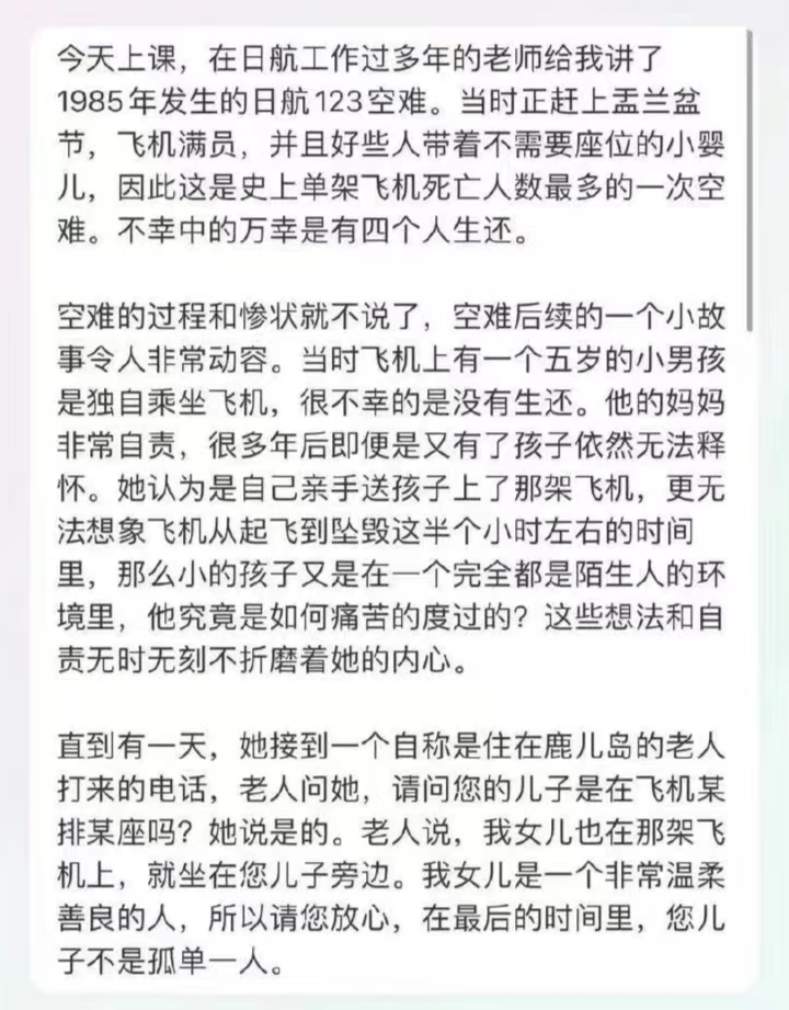 还有日航123空难,有个小男孩只有5岁,他独自乘坐飞机,很不幸的是没有生还。他的妈妈非常自责,她认为是自己送孩子上了那架飞机,直到接到另外一个遇难者家属的电话…
