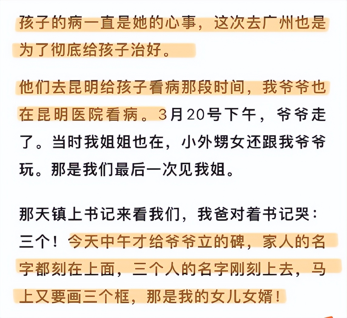 还有一个小伙向《中国青年报》讲述了姐姐一家的遭遇。她的姐姐是先天性失聪患者,只能听到别人发出的声音,听不懂说什么。“飞机坠落时,会不会影响我姐的助听器正常使用,姐姐会不会头疼?”姐姐和姐夫通过相亲认识 ,生的宝宝被查出来是“腮篓”,他们一家三口为了给孩子治病才搭飞机去广州。她们的女儿“小宝”,只有一岁半啊。因为原定的航班取消,才改签坐上了MU5735。而在得知航班出事前不久,在昆明医院看病的爷爷,也去世了。