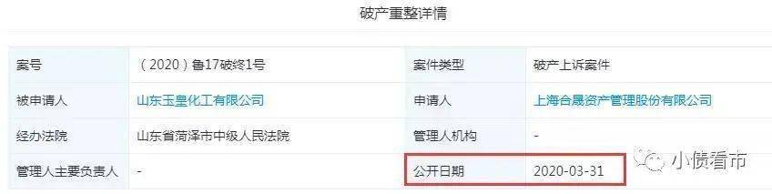 今年3月31日,玉皇化工被上海合晟资产管理股份有限公司申请破产重整,案号为(2020)鲁17破终1号,经办法院为山东菏泽市中级人民法院。