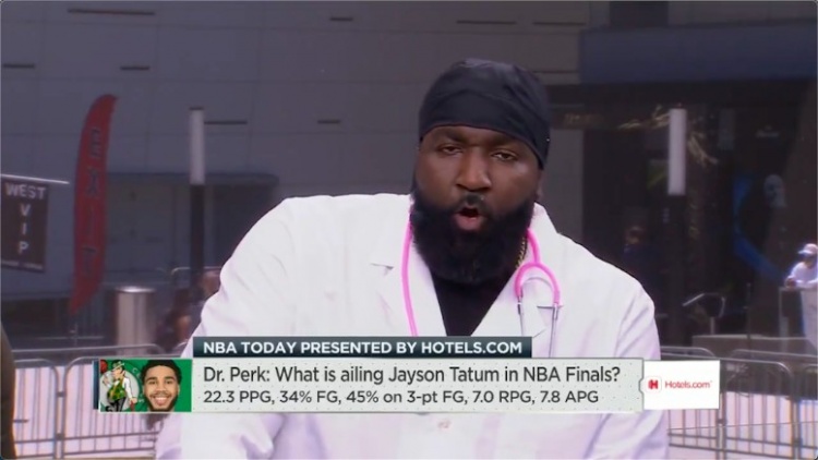 帕金斯打扮成一名医生为塔图姆做“诊断”,帕金斯说道:“他一直宣扬科比、一直记着科比,科比有曼巴精神。我在总决赛和科比打过几次。科比会自己干,这就是塔图姆所需具备的精神。”