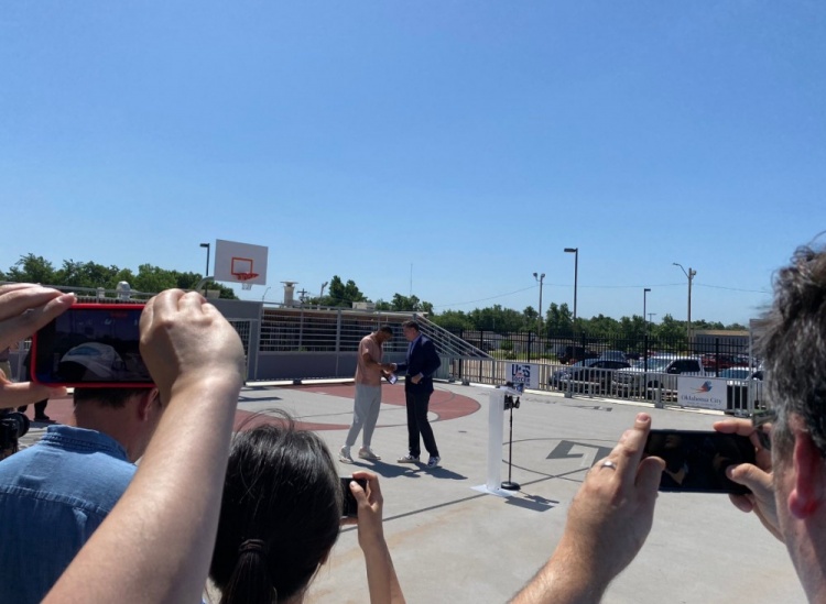 6月14日讯 今天,威少回到了俄克拉荷马捐赠了一个篮球场并完成了剪彩仪式。
