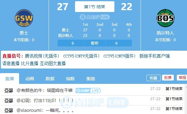 勇士在开节被打出12-2的情况下,节末完成反扑打出了一波11-0,首节结束以27-22反超绿军。