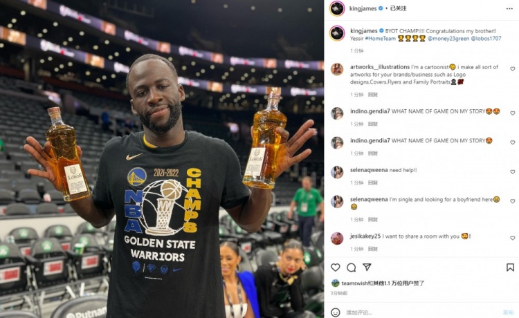 赛后,詹姆斯晒出了一张追梦手拿两瓶自己品牌洋酒的照片并配文写到:“冠军!!!恭喜你我的兄弟Yessir #主队