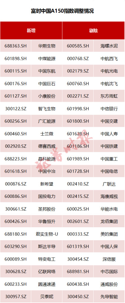 富时中国A150指数将华熙生物、中煤能源、中国东航、中国巨石、小康股份、智飞生物等多家公司纳入其中,而海螺水泥、中信银行、通威股份在被纳入富时中国A50指数的情况下被剔除,中航西飞、中航光电、中航沈飞、东方雨虹、中国人寿等公司也被剔除。