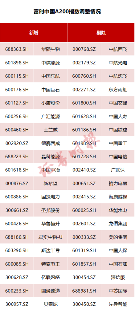 富时中国A200指数的调整情况与富时中国A150指数优点类似,华熙生物、中煤能源、中国东航、中国巨石等多家公司被纳入,而中航西飞、中航光电、中航沈飞、东方雨虹等被剔除。