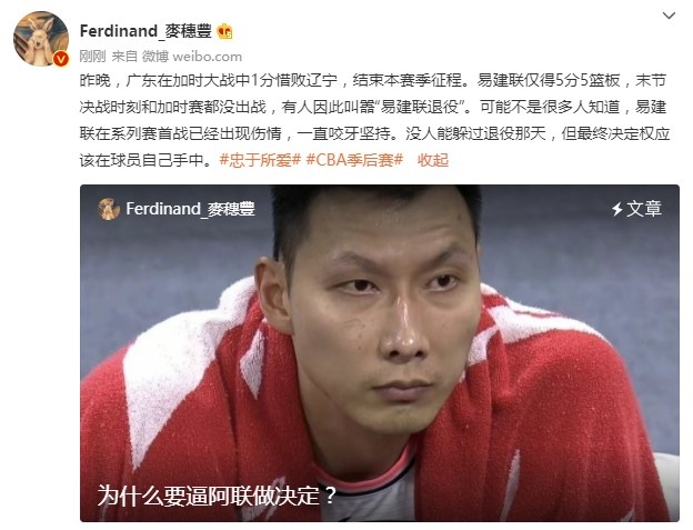 刚刚,媒体人麦穗丰发表了一篇《为什么要逼阿联做决定》的文章,并在微博中写道:“昨晚,广东在加时大战中1分惜败辽宁,结束本赛季征程。易建联仅得5分5篮板,末节决战时刻和加时赛都没出战,有人因此叫嚣‘易建联退役’。可能不是很多人知道,易建联在系列赛首战已经出现伤情,一直咬牙坚持。没人能躲过退役那天,但最终决定权应该在球员自己手中。”