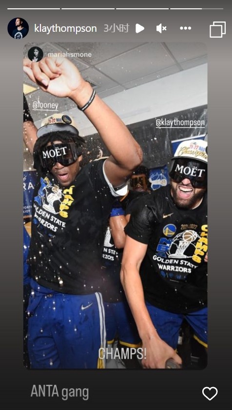 赛后,克莱晒出了自己跟卢尼喷洒香槟的合影,并称这个二人组为:安踏帮!