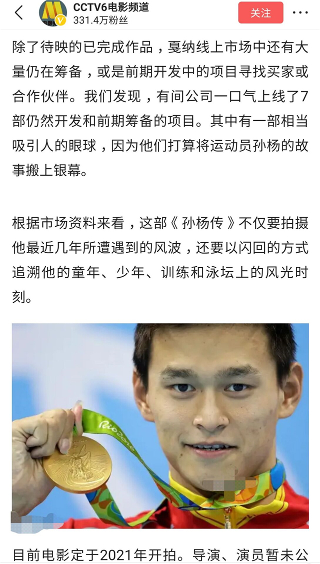 根据CCTV6的官方自媒体账号透露:“有间公司一口气上线部仍然开发和前期筹备的项目。其中有一部相当吸引人的眼球,因为他们打算将运动员孙杨的故事搬上银幕。根据市场资料来看,这部《孙杨传》不仅要拍摄他最近几年所遭遇到的风波,还要以闪回的方式追溯他的童年、少年、训练和泳坛上的风光时刻。”