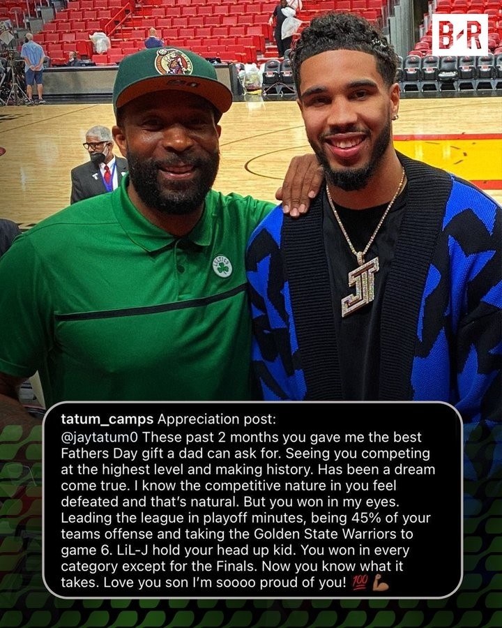“过去两个月是你给我最好的父亲节礼物。看到你在最好舞台竞争和创造历史,是梦想的成真。我知道竞争的天性让你感到失败,这是自然的,但在我眼里你已经赢了。季后赛出场时间领衔全联盟、创造了球队45%的进攻,并把勇士拖入第六场。抬起头来,你赢得了除了总决赛的一切。现在,你知道需要这需要付出什么,爱你,儿子,我为你感到骄傲!”
