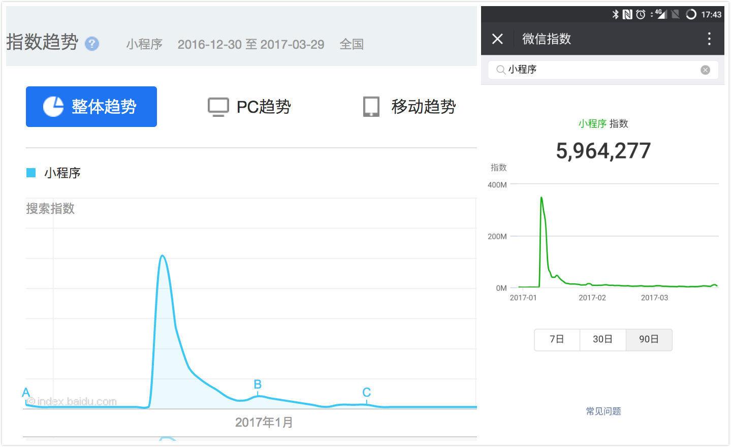 当然,这样的收紧策略也在一开始就影响了小程序的步伐。无论是百度指数还是微信指数,数据都很直接的告诉我们,小程序的表现并不理想。发布之后迅速攀升,之后的热度同样消退的很快,这对一个 MAU 9.63 亿的产品来说是有些不尽如人意的。