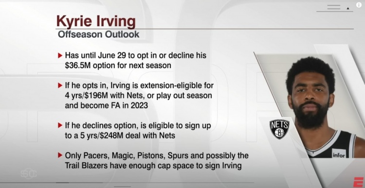 1.欧文必须在当地时间6月29日前决定是否执行下赛季的3650万美元的球员选项。