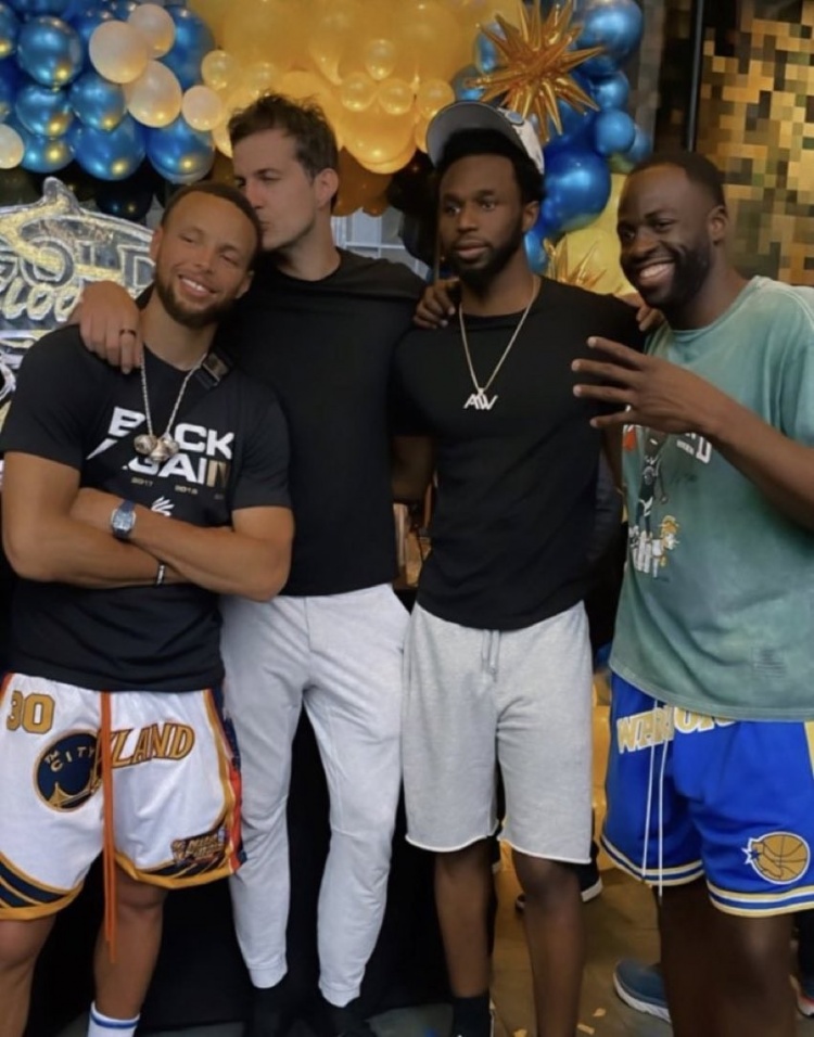 有人晒出了酒吧内球员合照,库里别利察维金斯追梦拍摄合照,别利察抱着库里的脑袋直接上嘴。