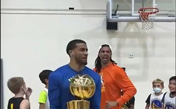 6月25日讯 今天勇士队球员小佩顿和达米安-李在勇士队的训练营向小球员展示总冠军奖杯,并用奖杯与小球员一一击掌,小球员无不欢呼雀跃。