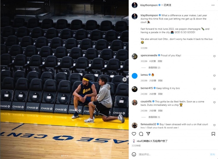 直播吧6月24日讯今日勇士球星克莱更新了Ins晒出多张照片。克莱配文写道:“这一年发生了多么大的变化啊,去年这个时候,里克(球队理疗师)还让我在球场上来回跑动
