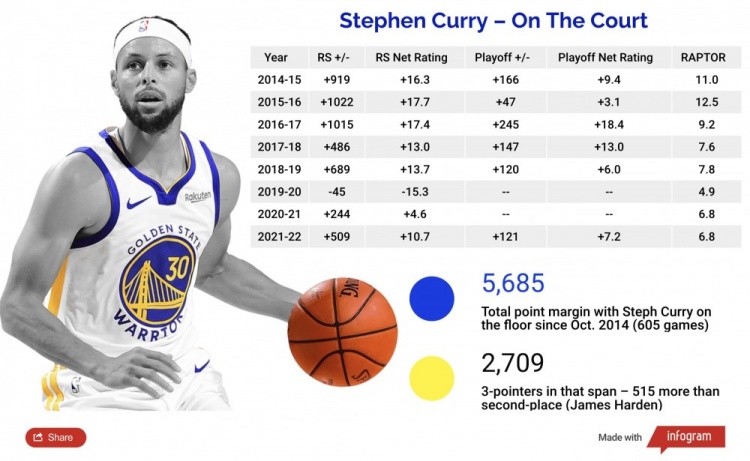 在这八年期间,库里的球场正负值总和(常规赛+季后赛)达到了5685,而同期他投进了2709记三分球,比同期第二名(哈登)多了515记。