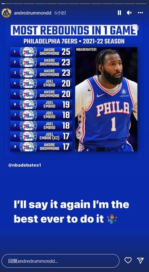 直播吧6月3日讯今天,德拉蒙德转发了一张本赛季76人球员单场篮板数排行榜的图片。数据显示,排名前三位的球员都是德拉蒙德,分别是25个篮板、23个篮板和23个篮板,在第四的位置他与恩比德并列(单场20个