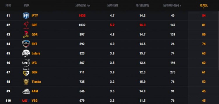 战队榜上,iFTY拿到84淘汰排名第一,身后的GRF拿到81个淘汰,第三的QDR也有80个淘汰入账。