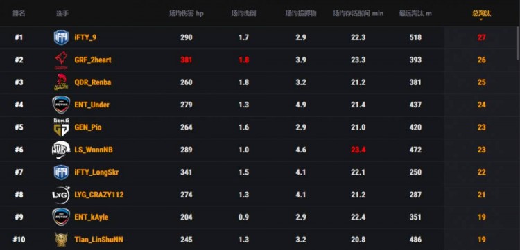 选手榜上,iFTY战队的9选手拿到27个淘汰排名第一。