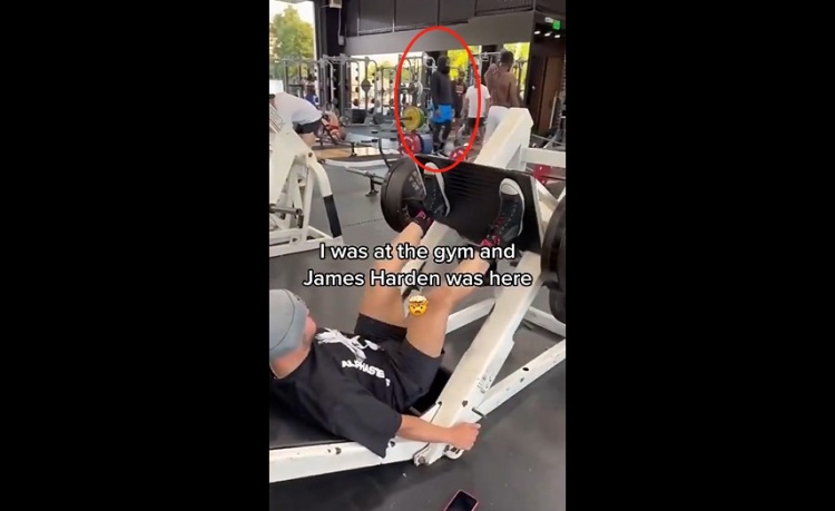 视频中,来到健身房的这位球迷,在健身房中碰到了和友人一同进行力量训练的哈登(蓝色短裤)。