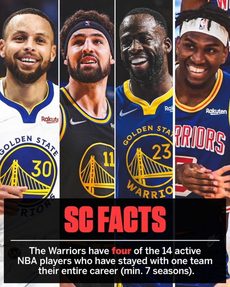 NBA现役仅有14名球员生涯仅为一支球队效力至少7个赛季,而勇士队就有4名,分别是库里、克莱、追梦格林和卢尼。