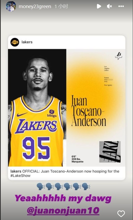 直播吧7月2日讯今日湖人官方宣布,球队正式签下前勇士球员胡安-托斯卡诺-安德森。勇士球员追梦格林更新Ins晒出安德森湖人官宣照,配文写道:“