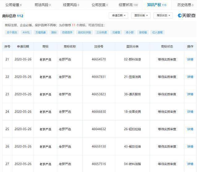 据报道,天眼查数据显示北京交个朋友数码科技有限公司申请注册了多个「老罗严选」商标,国际分类涵盖了方便食品、酒、珠宝钟表、日化用品、医疗园艺、服装鞋帽等,目前状态均为等待实质审查。