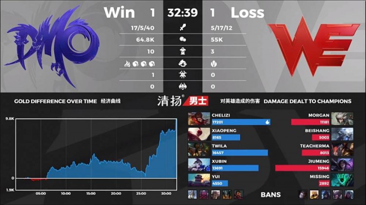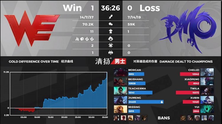 【23:00】双方在中路河道爆发团战,WE成功击杀DMO四人,随后开启大龙成功拿下。