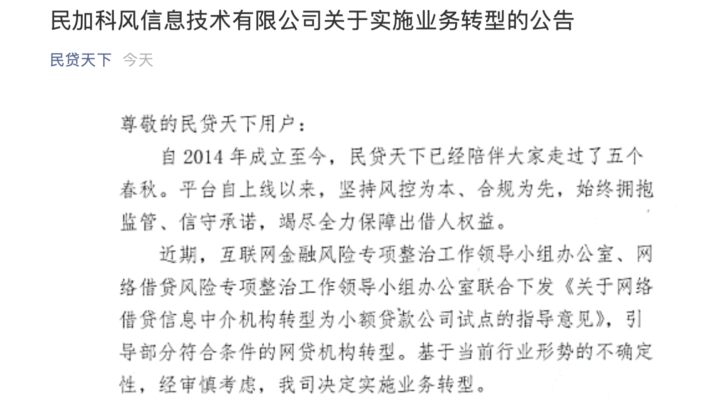 《公告》中提到,民贷天下基于当前行业形势的不确定性,经审慎考虑,决定实施业务转型。自2020年1月6日起,民贷天下正式启动业务转型和网贷业务良性退出工作。