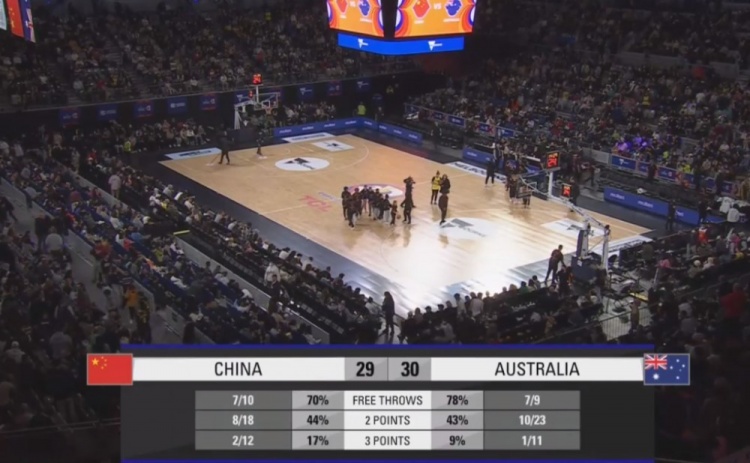 中国队暂时落后澳大利亚1分,半场比赛中国队赵睿拿下了全队最高的8分,周琦没有得分贡献4板3帽。