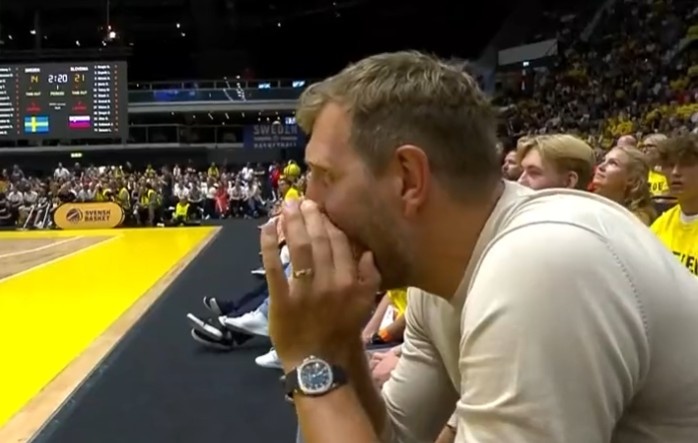 直播吧7月4日讯世预赛,瑞典vs斯洛文尼亚的比赛正在进行中,独行侠名宿诺维茨基率家人前来观战。有趣的是,现场有瑞典球迷呼喊起了东契奇“被高估”的口号(overrated),而司机直接加入了瑞典球迷的阵