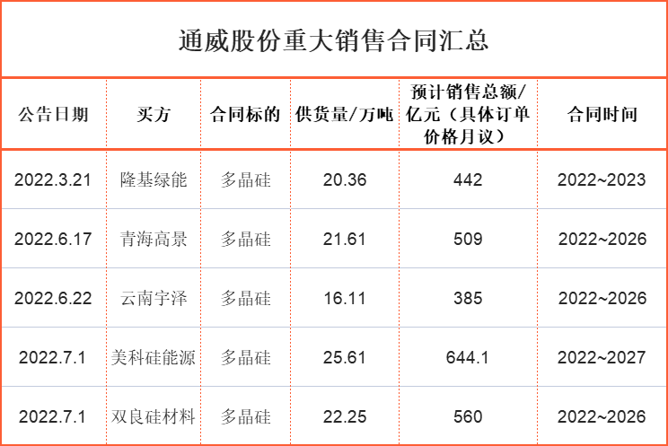 至此,通威股份2022年已签订5份重大销售合同,预计销售金额合计2540.1亿元,具体合同细节统计如下:
