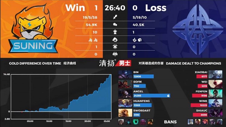 【15:40】双方在上河道交战,天使交出秒表躲掉奥恩大招,随后SN反打将宝石、奥恩两人击杀后拿下峡谷先锋;