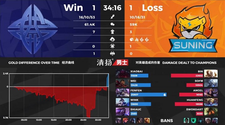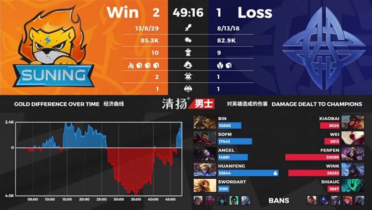 【23:00】在上河道莫甘娜留住男枪,虽然配合盲僧完成击杀,但是后续SN队友支援到场,发条、贾克斯无情包夹,SN击杀寒冰、盲僧、狗熊、莫甘娜四人后拿下大龙!