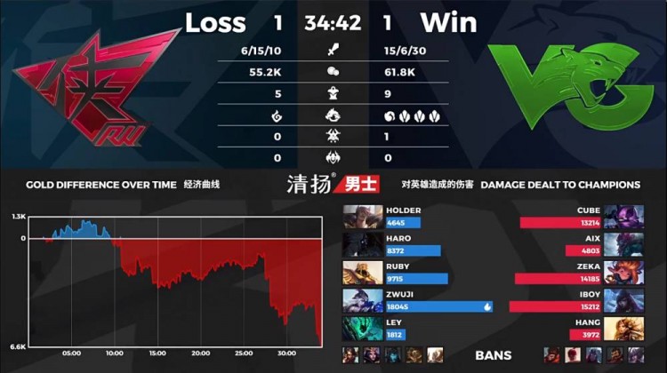 【15:40】双方在上河道相遇,锤石Q泰坦妖姬跟上伤害瞬间秒杀,随后RW开启峡谷先锋,加里奥也被带走。随后RW卡莉斯塔大招带锤石想杀寒冰,VG杰斯与泰坦赶到反杀卡莉斯塔。
