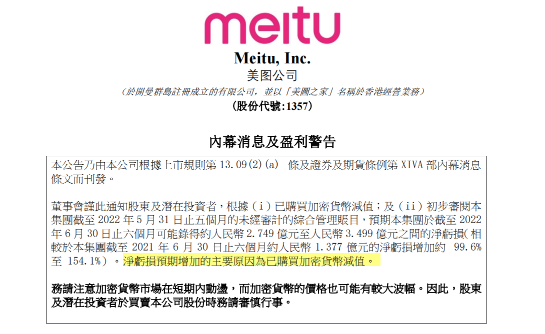 据此,美图预计,即将公布的2022年中期财报中,已购买以太币及已购买比特币分别确认减值亏损约1850万美元及约2710万美元,合计约为4650万美元,折合人民币3.11亿元。