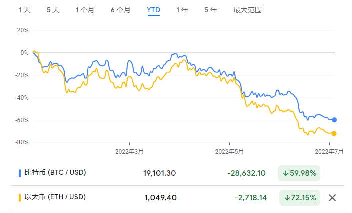 银柿财经记者注意到,年初至今,比特币的价格已大跌59.98%,以太币的价格也大跌72.15%。