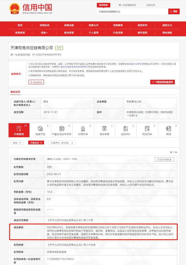 据“信用中国”网站显示,天津极兔供应链有限公司自2021年至今,已发生9起行政处罚事件。