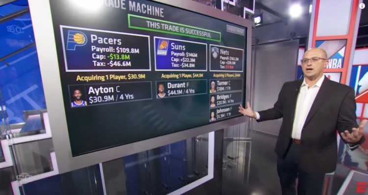 薪资专家Bobby Marks在今日的《SportsCenter》节目中运行了他的交易模拟器,给出了杜兰特去到太阳的一套可行的方案,这是一笔涉及步行者、太阳、篮网的三方交易。