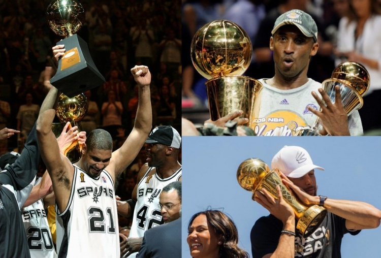 科比在2008-2009赛季及2009-2010赛季获得总冠军,邓肯在2004-2005赛季及2006-2007赛季获得总冠军,库里在2014-2015赛季及2021-2022赛季获得总冠军。他们也是当季各自球队中唯一一位入选了75大的球员。