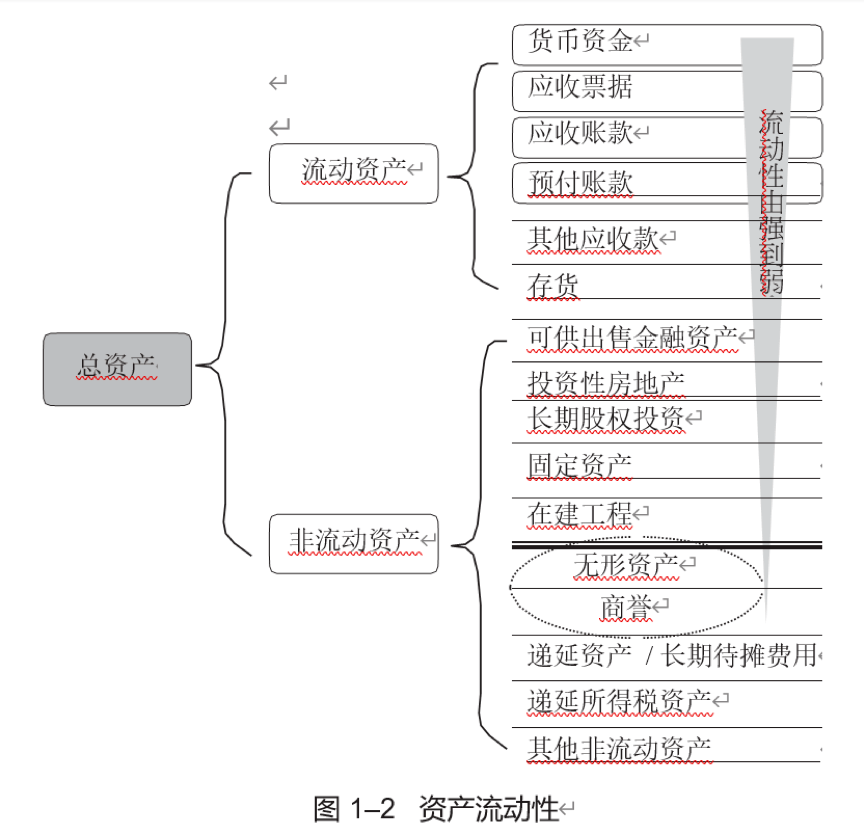 从这张图,我们可以看出,无形资产及商誉处于非常靠下方的位置。也就是说,其流动性非常差,不易变现。