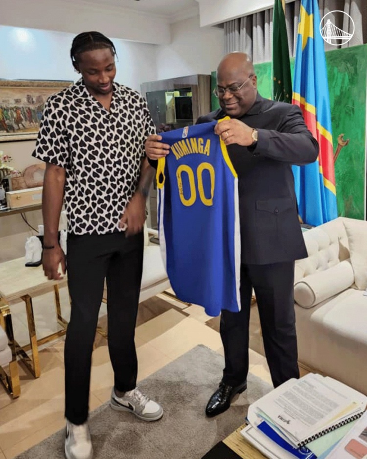 6月30日讯 勇士官推今日晒出了刚刚获得冠军的菜鸟库明加和刚果总统&总理会见的图片。