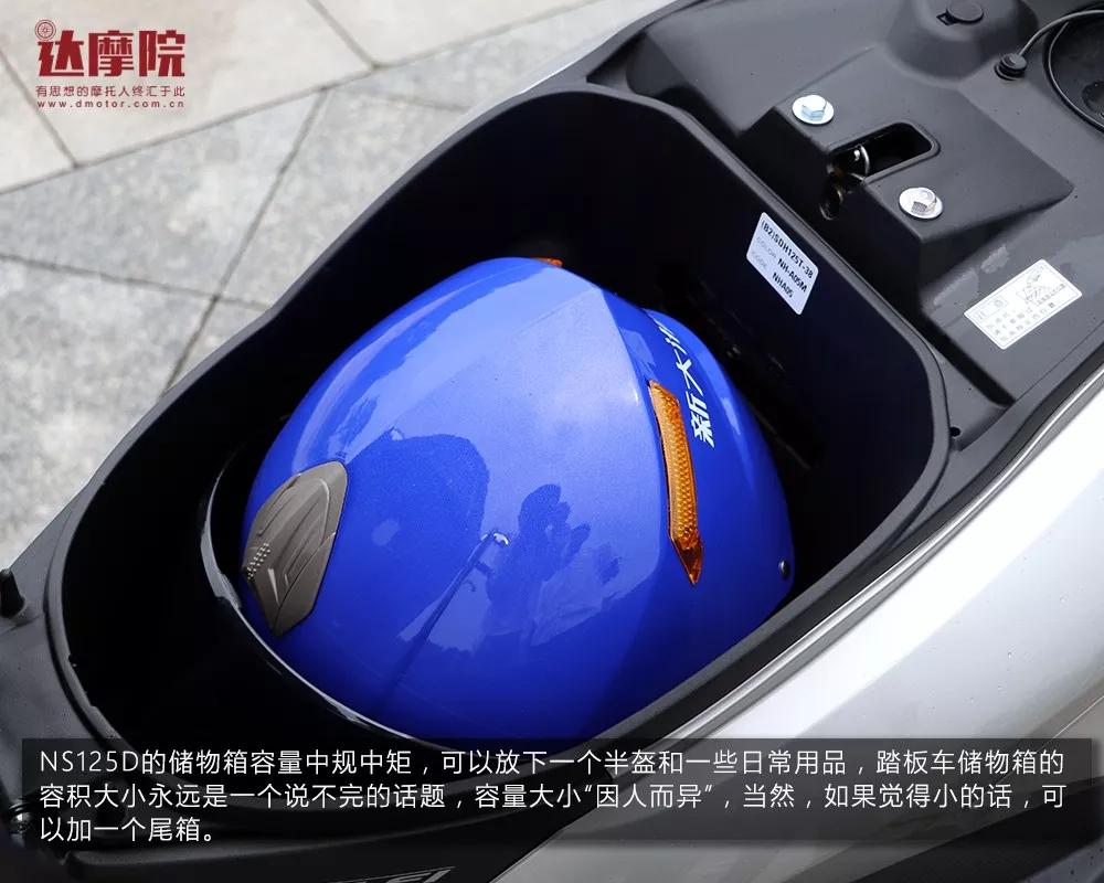 NS125D的储物箱容量中规中矩,可以放下一个半盔和一些日常用品,踏板车储物箱的容积大小永远是一个说不完的话题,容量大小“因人而异”,当然,如果觉得小的话,可以加一个尾箱。