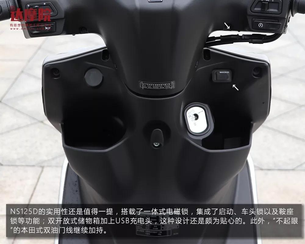 NS125D的实用性还是值得一提,搭载了一体式电磁锁,集成了启动、车头锁以及鞍座锁等功能;双开放式储物箱加上USB充电头,这种设计还是颇为贴心的。此外,“不起眼”的本田式双油门线继续加持。