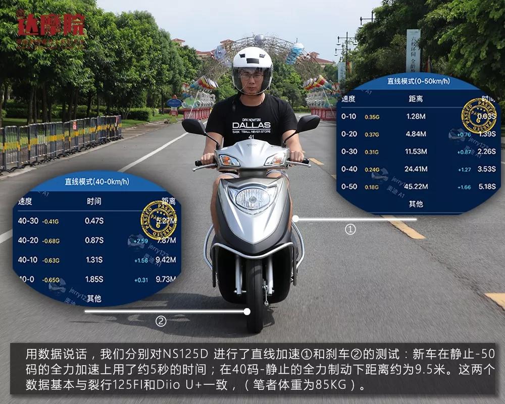 用数据说线D 进行了直线加速①和刹车②的测试:新车在静止-50码的全力加速上用了约5秒的时间;在40码-静止的全力制动下距离约为9.5米。这两个数据基本与裂行125FI和Diio U+一致,(笔者体重为85KG)。