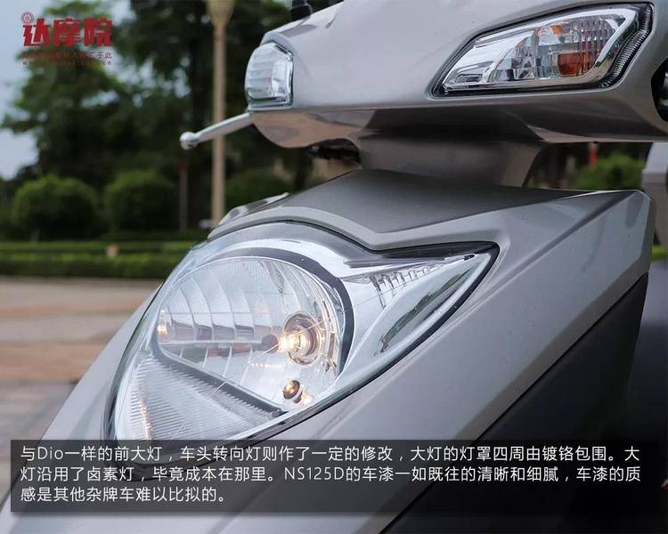 与Dio一样的前大灯,车头转向灯则作了一定的修改,大灯的灯罩四周由镀铬包围。大灯沿用了卤素灯,毕竟成本在那里。NS125D的车漆一如既往的清晰和细腻,车漆的质感是其他杂牌车难以比拟的。