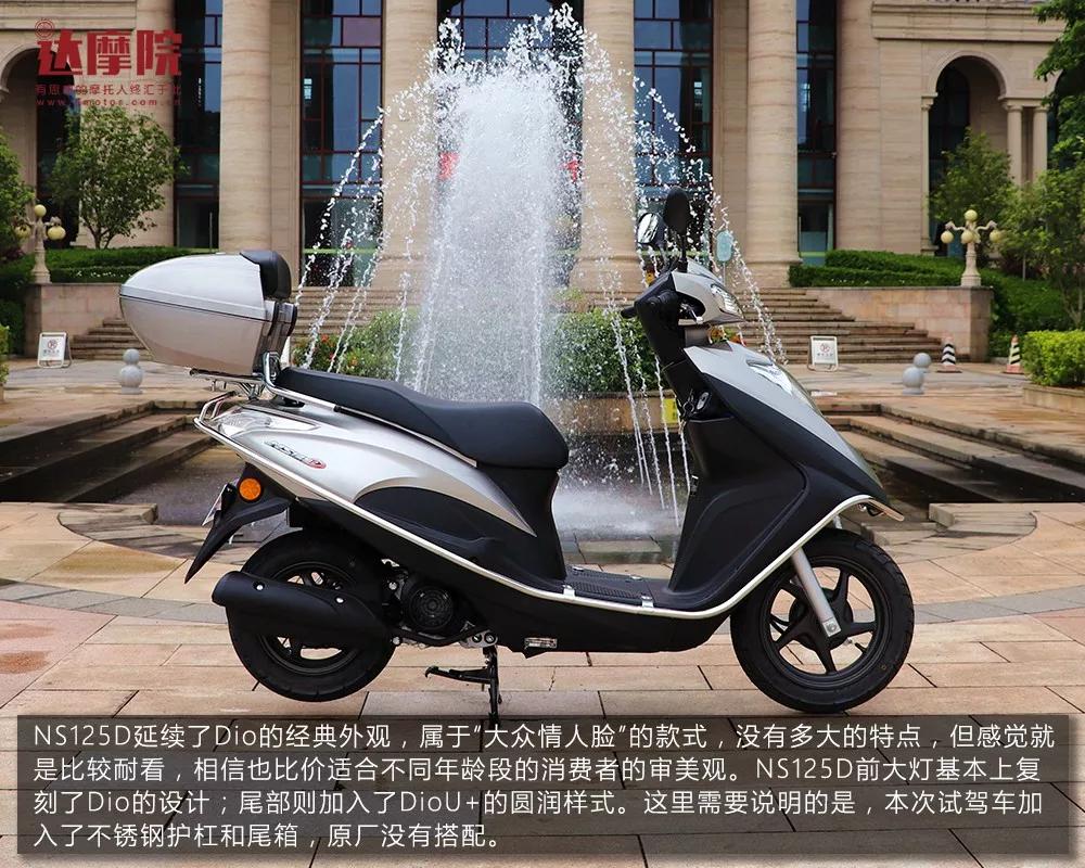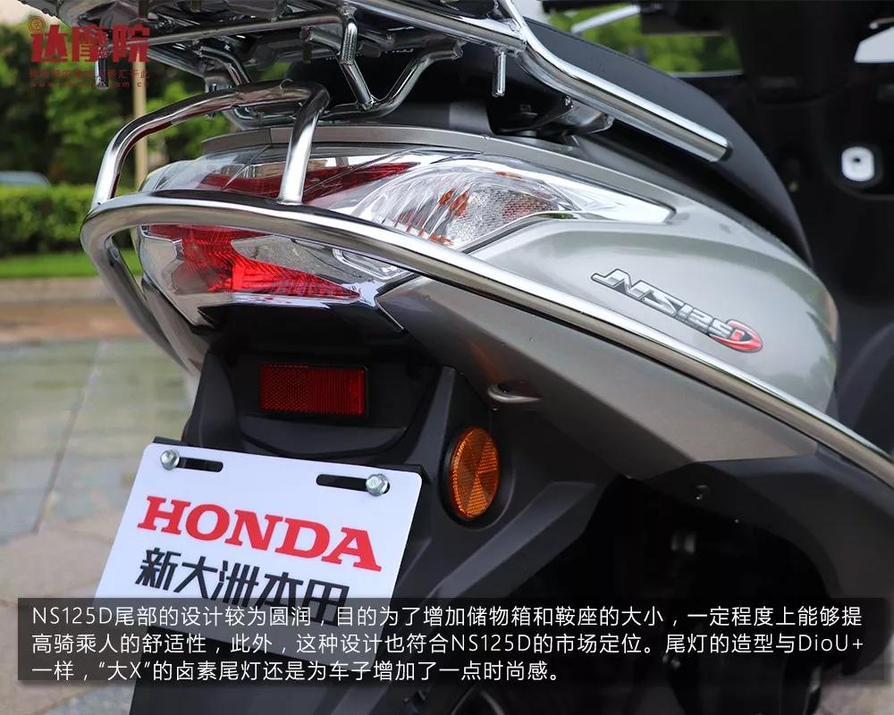 NS125D前大灯基本上复刻了Dio的设计;尾部则加入了DioU+的圆润样式。这里需要说明的是,本次试驾车加入了不锈钢护杠和尾箱,原厂没有搭配。