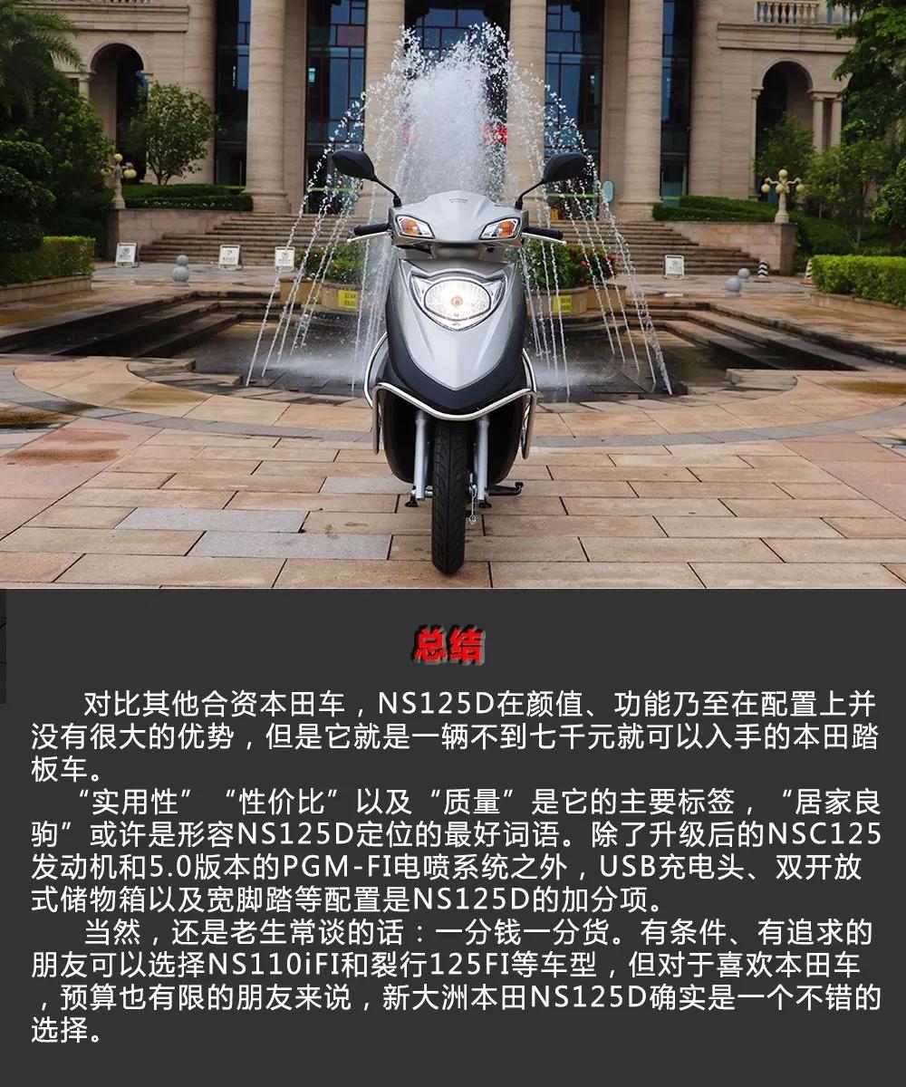 对比其他合资本田车,NS125D在颜值、功能甚至在配置上并没有很大的优势,但是它就是一辆不到七千元就可以入手的车子,“实用性”“性价比”以及“质量”是它的主要标签,“居家良驹”或许是形容NS125D定位的最好词语。