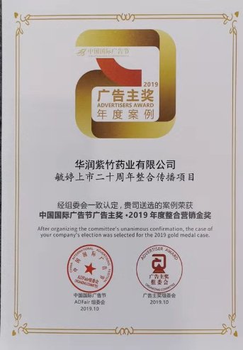 2019年10月27日,第26届中国国际广告节“2019广告主年度盛典”在江西南昌盛大举行,百余广告主亮相广告盛宴,众品牌企业汇聚南昌。典礼上企业、人物、案例各大奖项名单逐一揭晓,华润紫竹旗下的紧急避孕药品牌毓婷,凭借“毓婷上市二十周年整合传播项目”,斩获“中国国际广告节广告主奖2019年度整合营销金奖”。